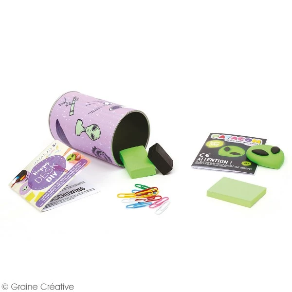 Voici un joli coffret Patagom Boîte métal Happy Desk Alien grâce auquel vous pourrez créer vos propres gommes personnalisées. Tous les éléments de ce kit sont regroupés dans une jolie boîte en métal à motifs de l’espace qui décorera le bureau, parfait comme idée cadeau !