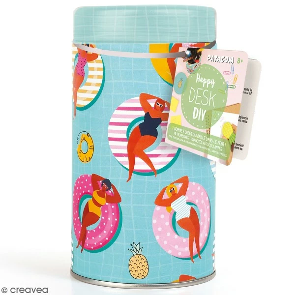 Voici un joli coffret Patagom Boîte métal Happy Desk Tropical grâce auquel vous pourrez créer vos propres gommes personnalisées. Tous les éléments de ce kit sont regroupés dans une jolie boîte en métal à motifs estivaux qui décorera le bureau, parfait comme idée cadeau !