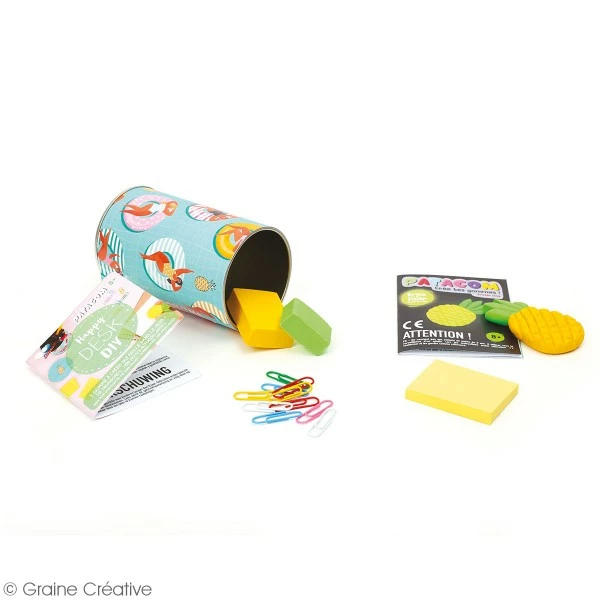 - Boîte métal Happy Desk contenant : 2 pains PATAGOM qui brillent dans le noir, 10 trombones, 100 notes autocollantes et 1 pas à pas