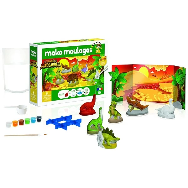 - Contenu du coffret : 1 sachet de plùtre de 800g, 6 moules dinosaure, 8 croisillons, 6 mini pots de peinture, 1 pinceau, 1 décor de jeu 3D