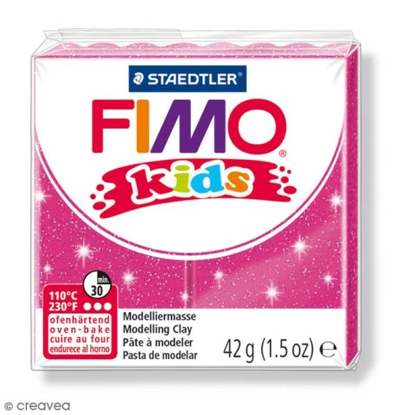 Chaque pain de Fimo Kids glitter (42 grammes) est vendu dans un sachet refermable, ce qui permet de bien conserver la pĂąte non utilisĂ©e. Les enfants devraient apprĂ©cier l’effet pailletĂ© de cette pĂąte qui apportera de la fantaisie Ă leurs modelages !