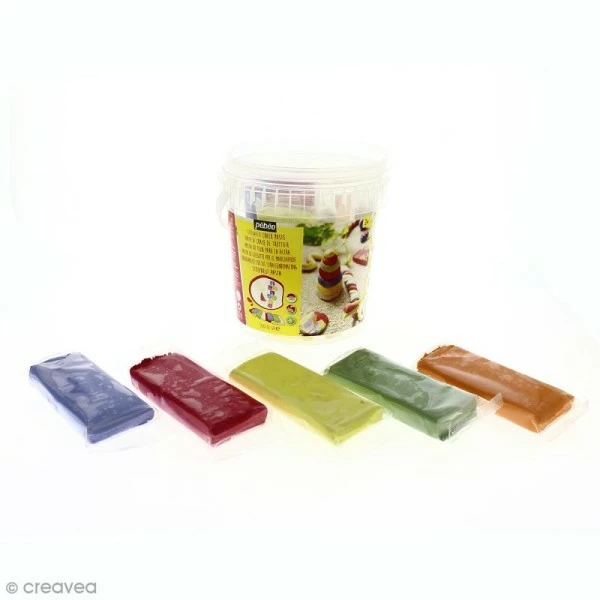 Seau de 10 pâtes à craie pour trottoir de diverses couleurs : Rouge, Jaune, Vert, Blanc, Bleu, Vert, Orange. Cette pâte autodurcissante minérale naturelle (sans Gluten) est une super activité à faire avec les enfants. Les 10 pains de pâte à craie viennent dans un seau en plastique où vous pourrez ranger la pâte non utilisée afin qu’elle soit bien conservée.